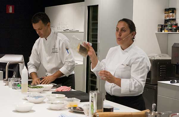 The demo is fascinating stuff, headphones deliver non Spanish speakers a fluent simultaneous translation. A good selection of Michelin starred chefs are lined up to appear here well into 2014 and today’s chef, the ebullient holder of two Michelin stars at her Galician restaurant El Stacion, Beatriz Sotelo, is a natural teacher. She talks about her beloved Galicia and its superb seafood and sends out tasters as she works that we fall upon greedily and which make us hungry for the evening meal.