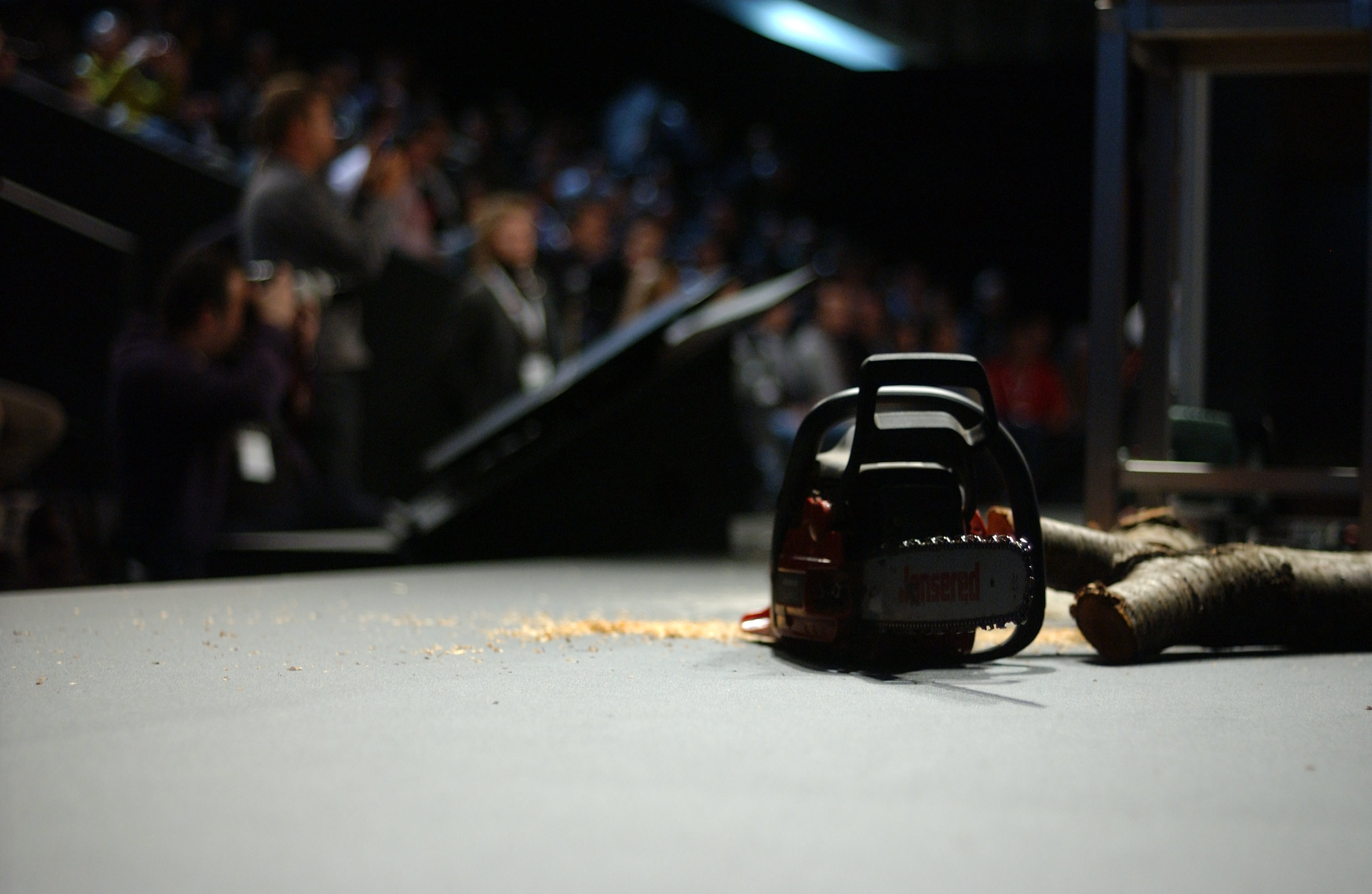 Reassured, they begin busily brushing up sawdust and woodchips, the detritus of the previous chef,Stefan Wiesner’s performance, one which involved noisily carving his own serving platters out of cherry wood using a petrol chainsaw. At Madrid Fusion you have to have an eye-catching act, cooking will only get you so far these days.