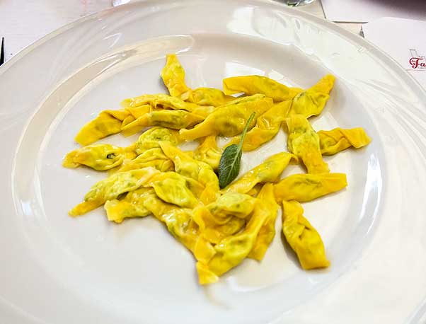 A few days are soon lost and a regretful last lunch is taken at the roadside restaurant Da Faccini near the Castell ‘Arquato.The sun’s still warm in October so I sit outside to enjoy more meats, an exquisite soup of pumpkin and cepe mushrooms perfectly in season, and a plate of ‘caramelle’ dressed in sage butter. Caramelle are tubes of pasta filled with ricotta and spinach with the ends twisted so that they resemble sweets. Again the simplicity is striking and the flavour sublime.