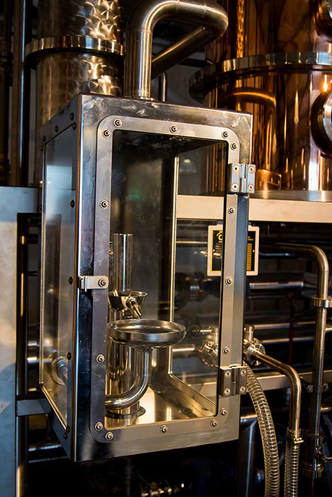 To the side is a ‘kitchen’ where experimental distillations are tried out and above that a rather nice bar, well-stocked with gin of course.