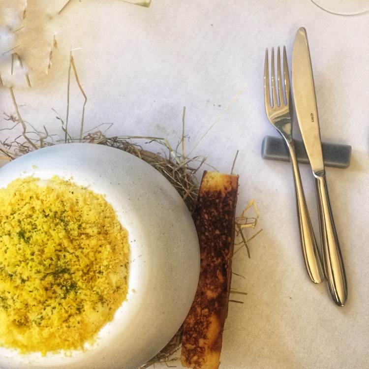 In its dished top is slow confit yolk, topped with English Exmoor Caviar. There’s a hay and potato foam, dried corn, caviar oil, preserved egg yolk and dried greens from the pasture. With it comes an witty oversized brioche ‘soldier’.