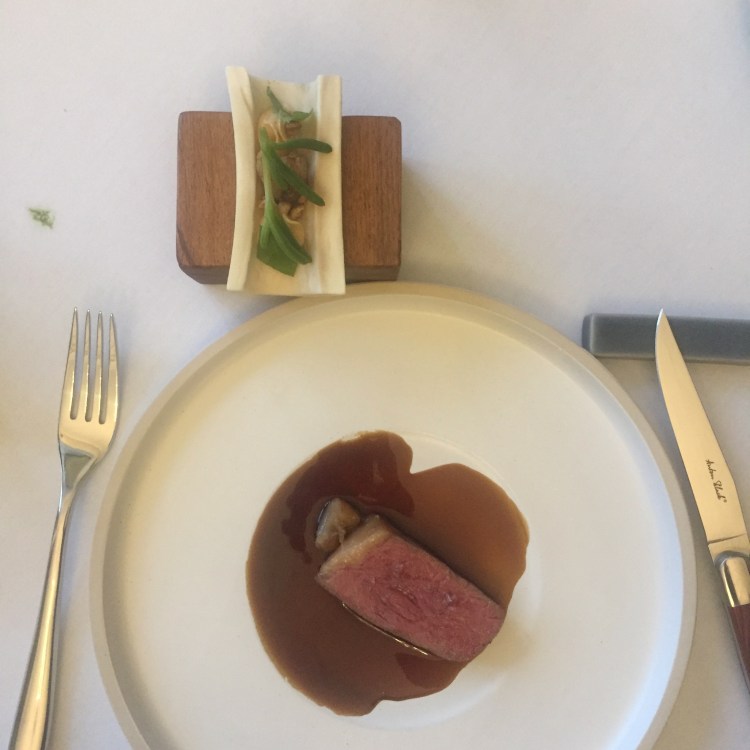 The richly-flavoured meat has been made into a doughnut, and served with a savoury carrot sugar, chilli jam made from carrots grown on the estate and served on moss beds. Wonderful deeply flavourful complete bites, one per person, which is just enough,