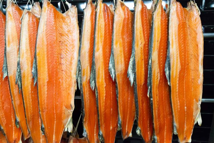 The arriving salmon are swiftly cleaned and split in half, then sprinkled with rock salt before being hung up to dehydrate. Hanging while curing stretches the flesh, helping tenderise it.