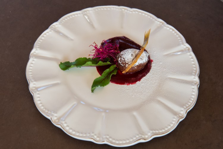 So having eaten many of my potatoes, P is unable to do dessert so I order chestnut mousse and toffee, a seriously sweet dish with that unique chestnut taste I recall from my days at Scout camp, something I now try to repress. It’s gorgeous.